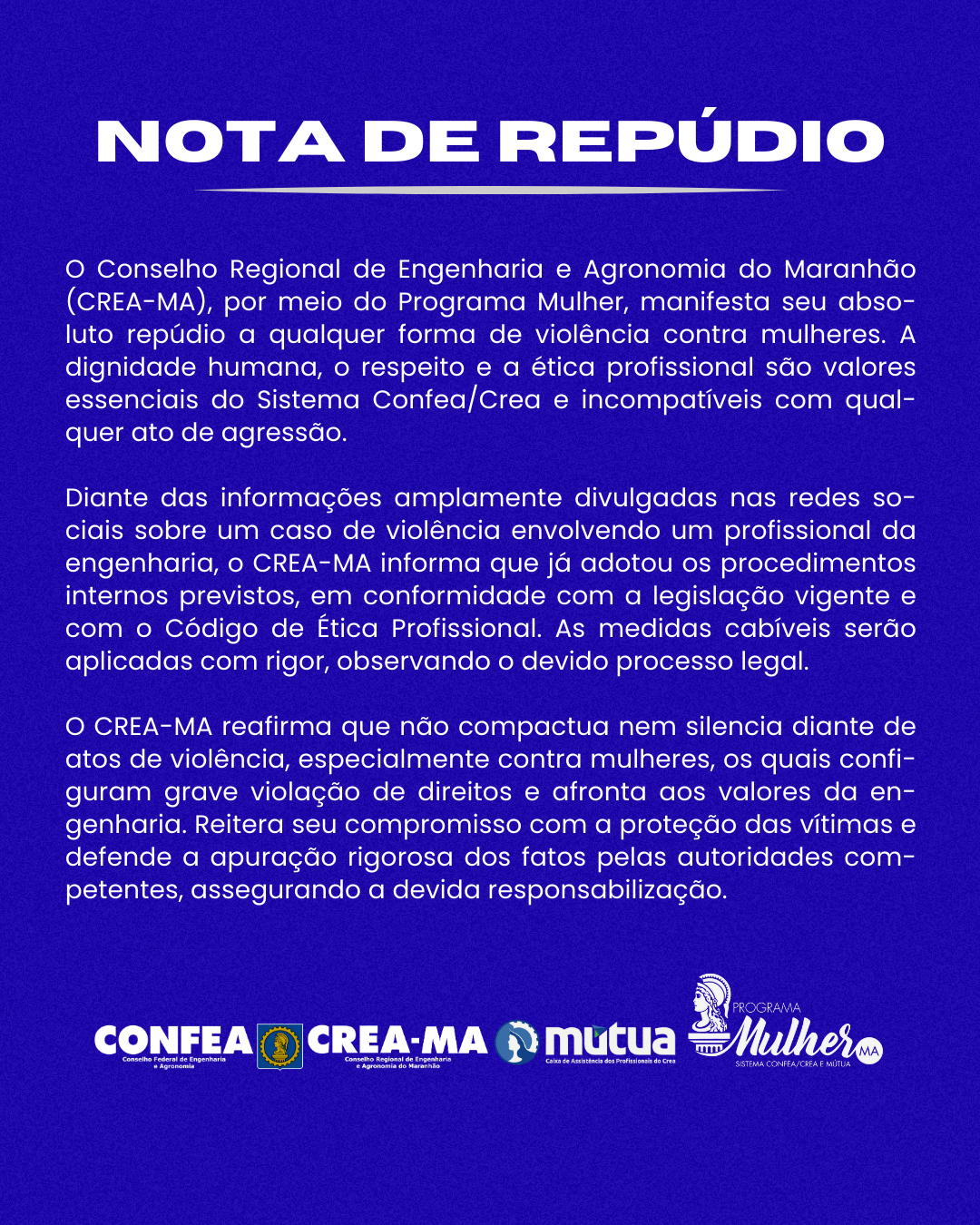 O Conselho Regional de Engenharia e Agronomia do Maranhão (CREA-MA), por meio do Programa Mulher, manifesta seu absoluto repúdio a qualquer forma de violência contra mulheres. A dignidade humana, o respeito e a ética profissional são valores essenciais do Sistema Confea/Crea e incompatíveis com qualquer ato de agressão.