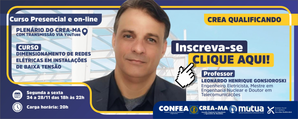 Crea Qualificando – Assim como todos os cursos ofertados pelo CREA-MA por meio do Programa Crea Qualificando, o “Dimensionamento de Redes Elétricas em instalações de baixa tensão” será totalmente gratuito. O curso será realizado entre os dias 24 a 28 de novembro, das 18h às 22h, com transmissão ao vivo pelo YouTube e opção de participação presencial no Plenário do CREA-MA, em São Luís. A capacitação será ministrada pelo professor e eng. eletric. Leonardo Henrique Gonsioroski, Mestre em engenharia nuclear e doutor em telecomunicações